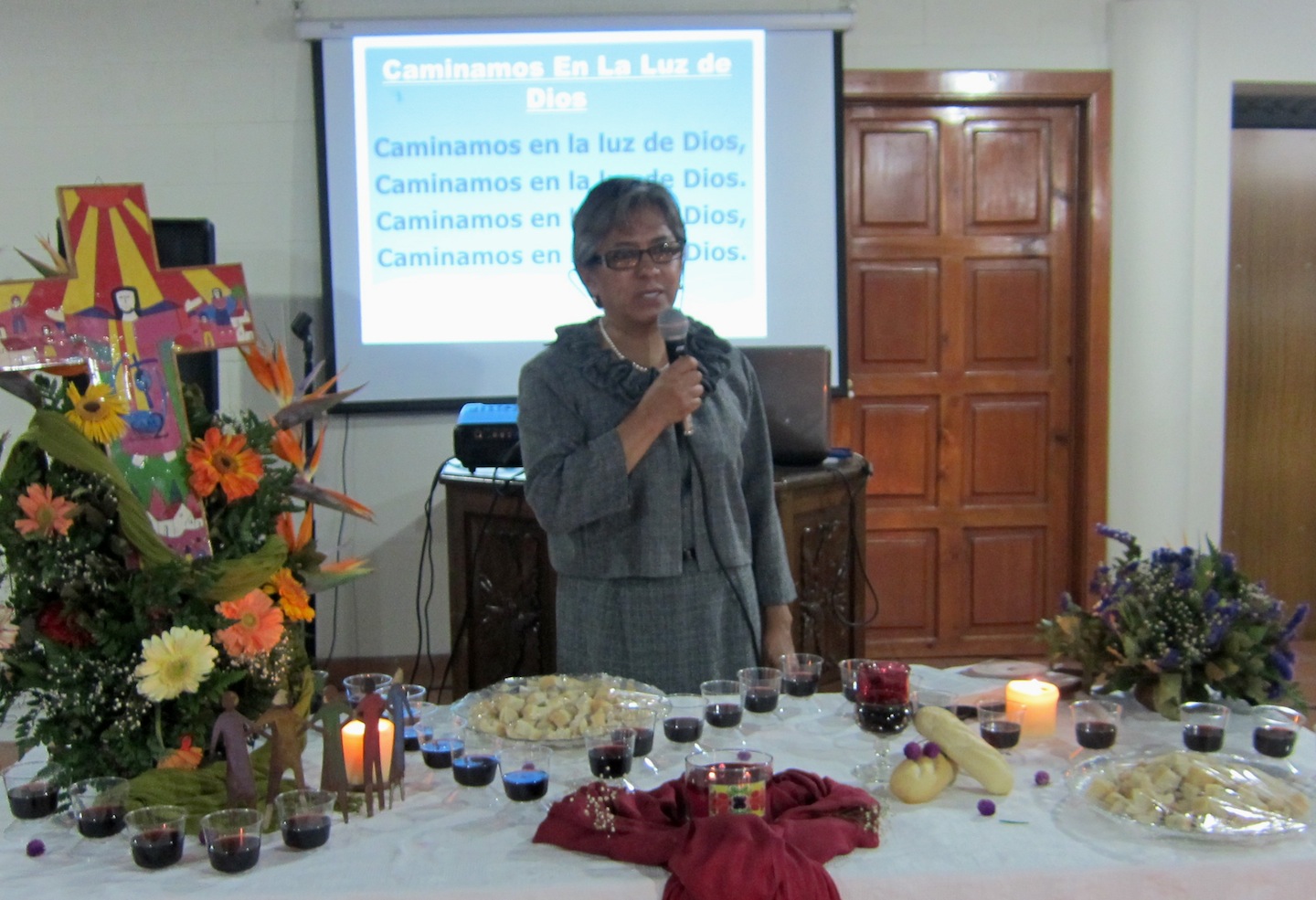 En medio de gratitud y alegría celebramos la Cena del Señor. Nuestra liturgia se simbolizó por un camino de granos de maíz y velas encendidas, símbolos que nos ayudan a reconocer el sustento fiel de Jesús, Dios nuestro, siempre solidario caminando junto con nosotras y alumbrando con su Luz nuestro caminar. El pan que produce vida en cada una y la copa para dos.