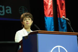 Avant le message de Kaga, Larry Miller, ancien secrétaire général de la CMM, et Anne-Cathy Graber de Paris, France, ont apporté les salutations du Forum Chrétien Mondiale.